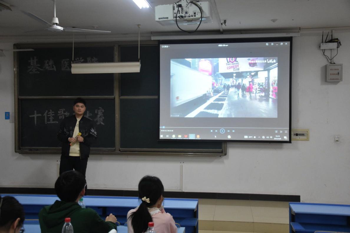 2023年4月8日19:00,基础医学院“筑梦青春·唱响未来”十佳歌手大赛决赛在前湖南院2-402举行。本次决赛分为两轮,第一轮由初赛前十名选手依次演唱歌曲,每位选手演唱完毕后评委打分平均分前六进入第二轮。