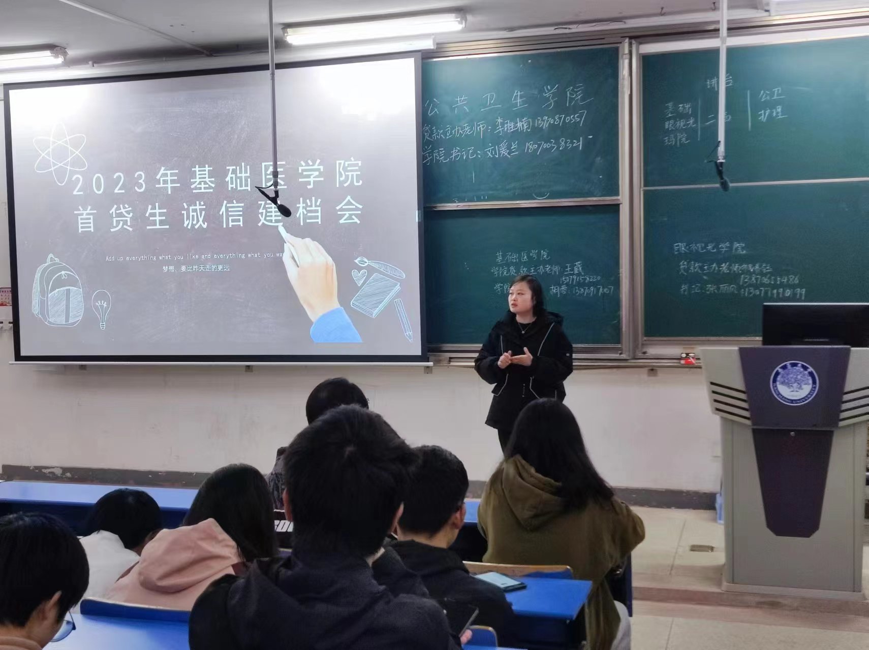 进一步增强学生的诚信意识和金融风险意识,强化资助育人实效,2023年3月18日,由校学生资助中心主办、基础医学院承办的诚信建档会成功举办。本次诚信建档会目的在于并指导获贷同学正确填写诚信档案并强调诚信的重要意义。我院资助对口老师王葳和2022年全体首次获贷生参加了本次会议。