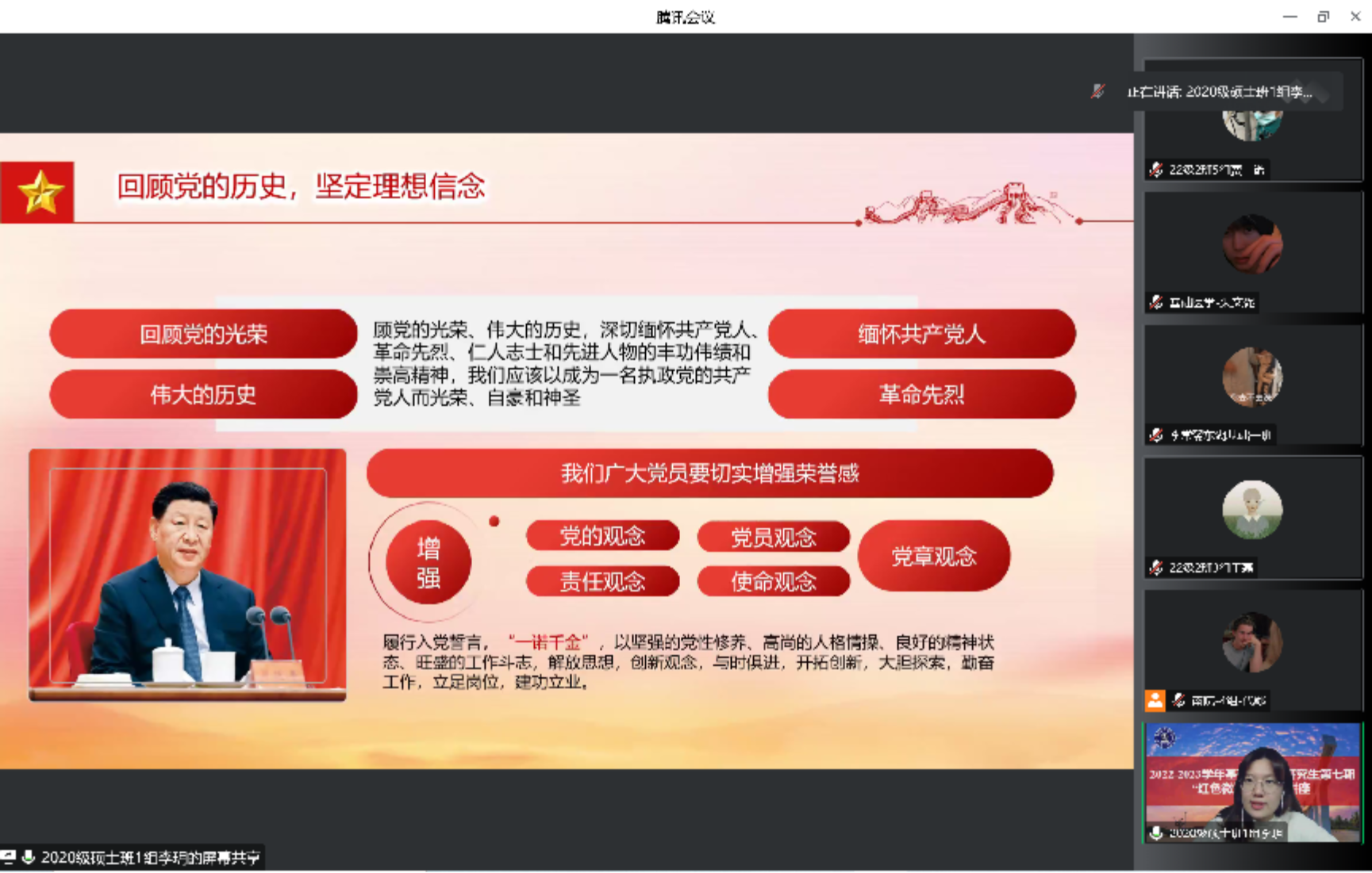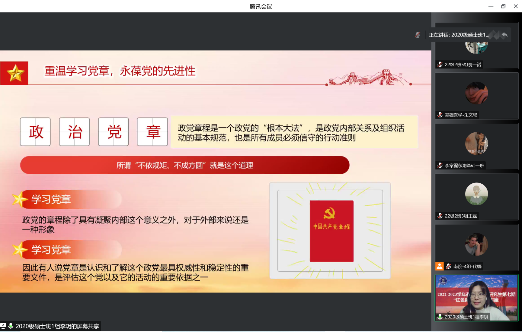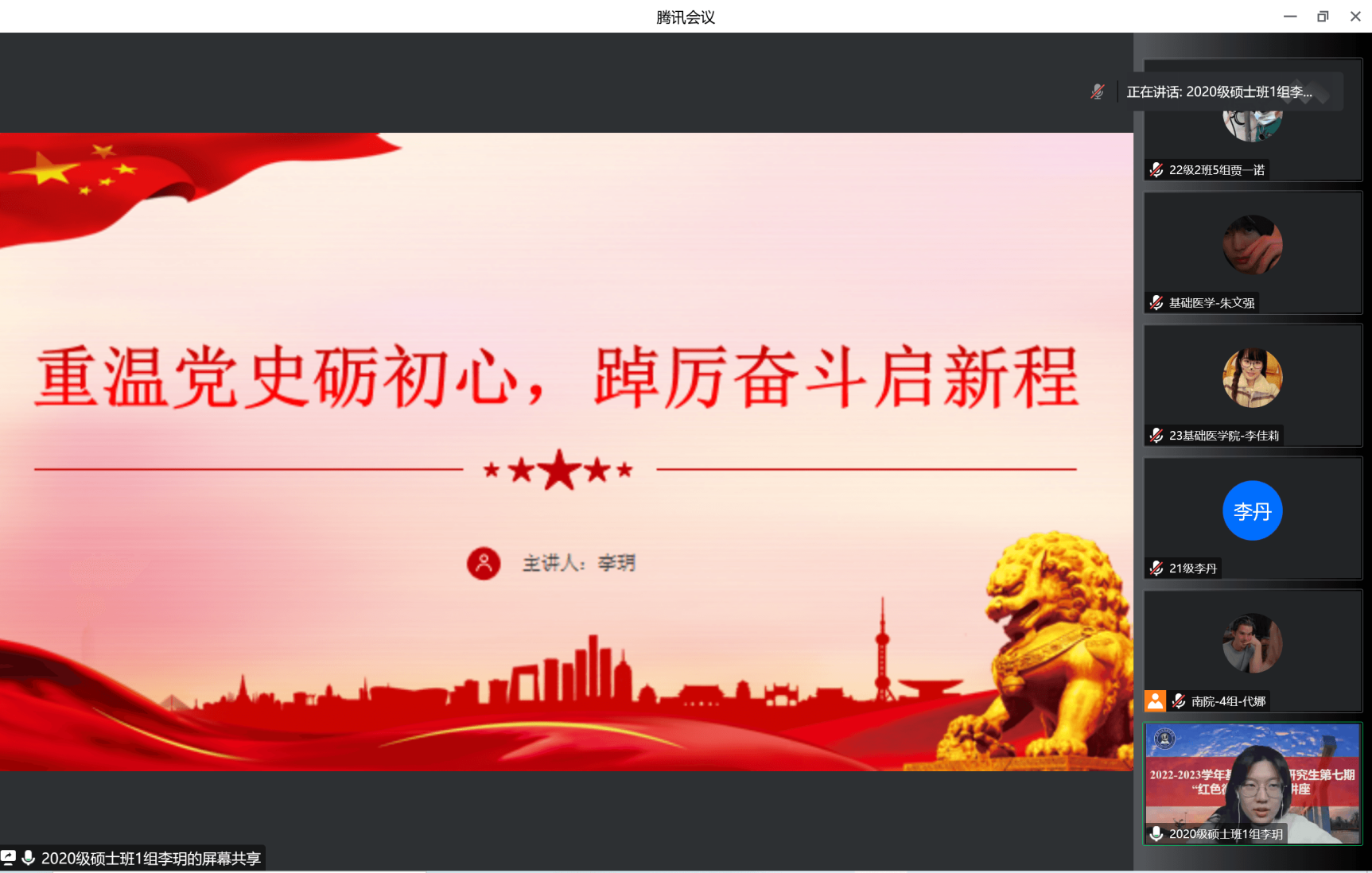(编辑:贾一诺;拍摄:贾一诺;初审:李佳莉)百年征程波澜壮阔,百年初心历久弥坚。为进一步推动学习宣传贯彻党的二十大精神,加强爱国主义教育,弘扬光荣革命传统,基础医学院研究生党支部推出“红色微讲堂”系列活动。本期红色微讲堂由代娜同学担任主持人,李玥同学担任主讲人,本期主讲的主题为“重温党史砺初心,踔厉奋斗启新程”。