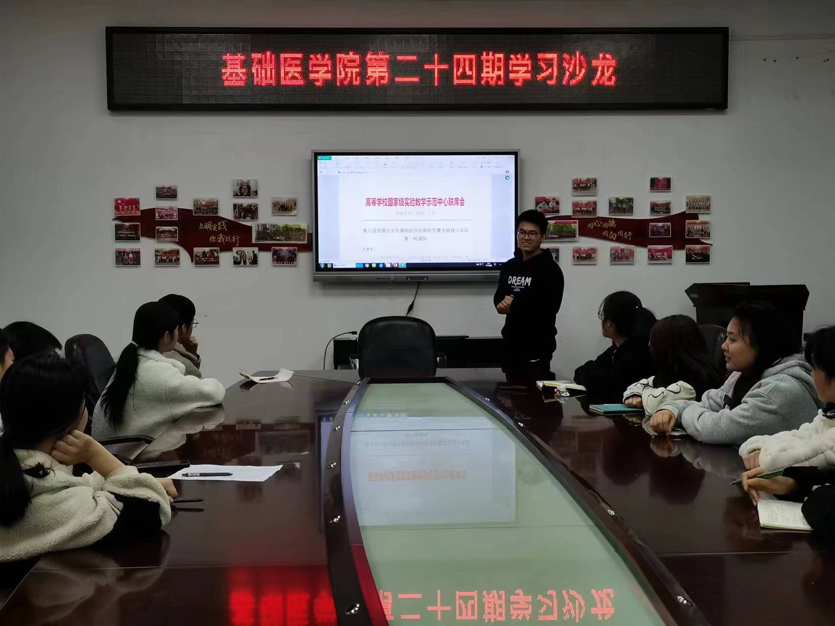为进一步加强学生朋辈助航作用,加强优秀学生的榜样示范能力,3月26号晚上7点,基础医学院本科生开展了第二十四期学习沙龙,本期活动由温英玲同学和徐孟江同学为大家进行全国大学生基础医学创新研究暨实验设计论坛参赛经验分享,以期鼓励更多同学参加全国大学生基础医学创新研究暨实验设计论坛,增强学术交流与合作,活跃学术氛围,提高科研实力。