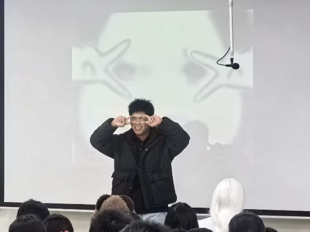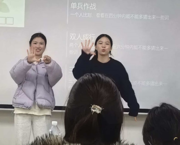 “这个动作!我知道!”阵阵欢呼声中,“你来比划,我来猜”环节火热上演。台上的同学脑洞大开,手脚并用,倾尽全力演绎着一个个词语——同学们模仿某歌星标志性刘海的瞬间,台下立马有人高声喊出正确答案,默契值直接拉满!生动的表演、快速的反应,将全场气氛推向一个又一个高潮,教室里满是此起彼伏的喝彩声。