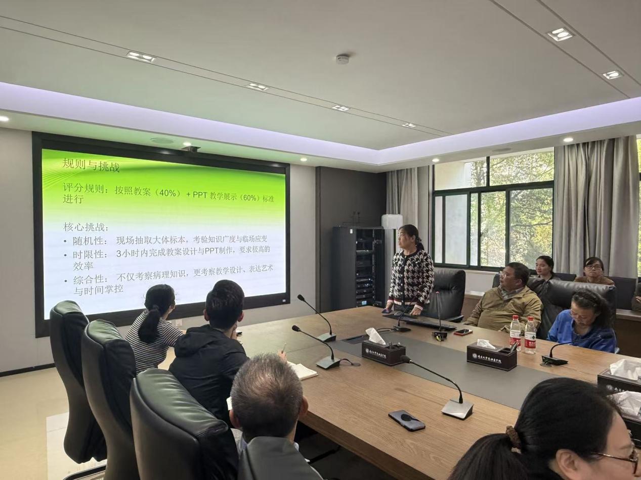 熊秀娟老师介绍了病理学组“3小时现场备课+10分钟徒手标本讲解”的惊险赛制。她们用“大体标本—镜下切片—临床预后”三位一体框架,将随机抽到的“子宫颈癌外生菜花型”标本转化为“早诊早治”课程思政案例,并首次尝试用DeepSeek生成双语问题链,提升课堂互动梯度。