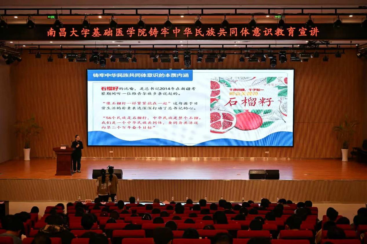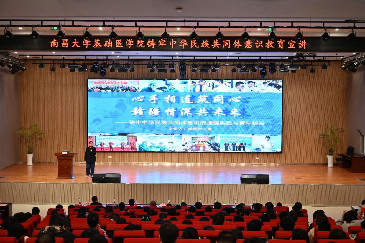 为深入学习贯彻习近平总书记关于加强和改进民族工作的重要思想,推进大学生铸牢中华民族共同体意识教育,基础医学院于10月31日晚在医学科技创新中心一楼报告厅举办铸牢中华民族共同体意识主题教育宣讲。学院辅导员王葳老师以“江西实践与青年担当”为主题,通过展示江西这片红色土地上的各族干部群众感恩奋进、同心向党,全方位探索铸牢中华民族共同体意识的鲜活案例,引导各族学生深刻理解国家观与民族观的丰富内涵,为青年学子上了一堂生动的思政教育课。