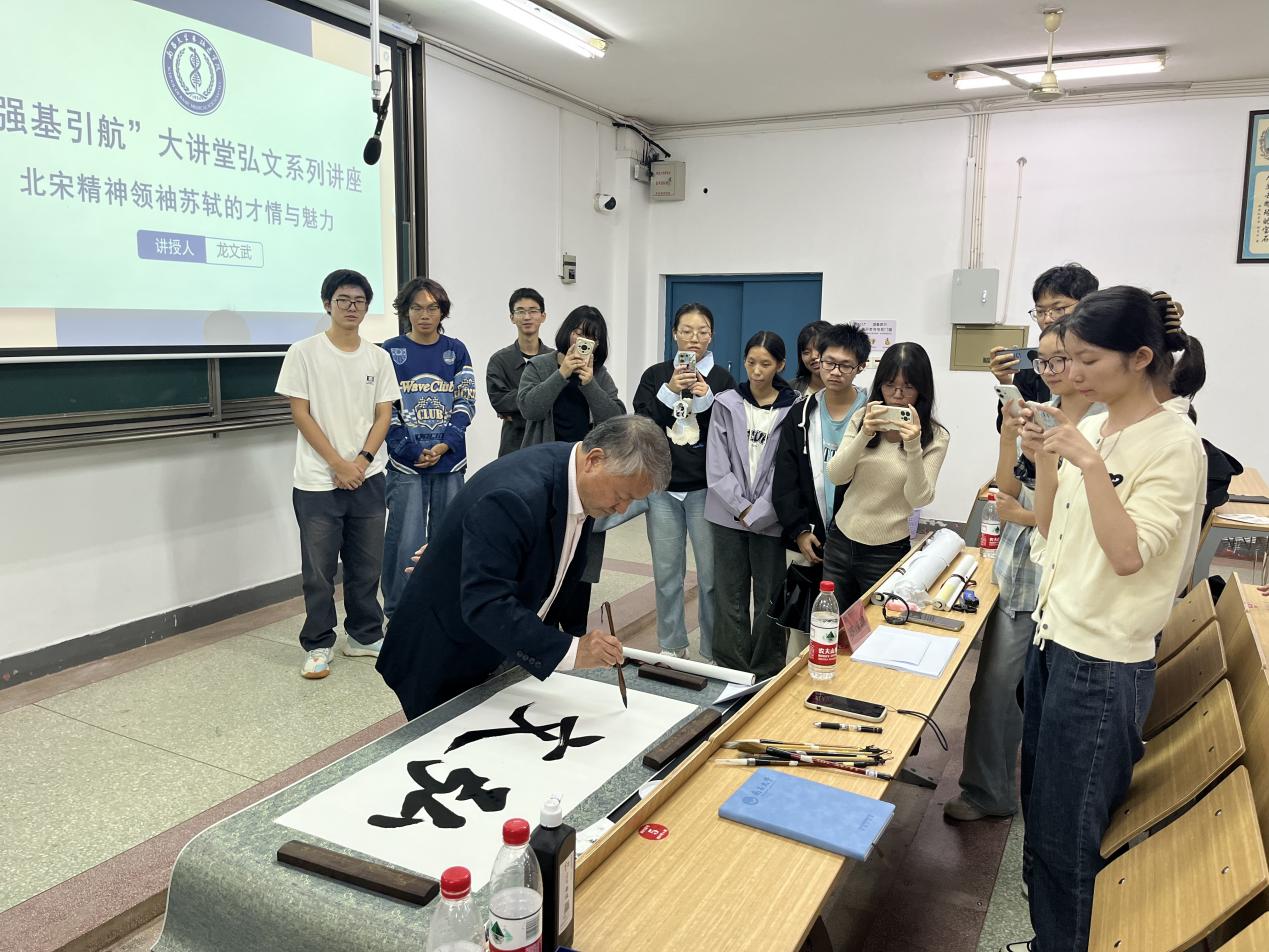 讲座伊始,龙文武老师以苏轼的教育背景和早年经历为切入点,生动讲述了这位文豪的成长轨迹。他特别分享了苏轼在科举考试中发生的趣闻轶事。通过这些鲜活的事例,展现了苏轼卓越的才华和独特的个性,让在场师生对这位历史名人有了更深入的了解。