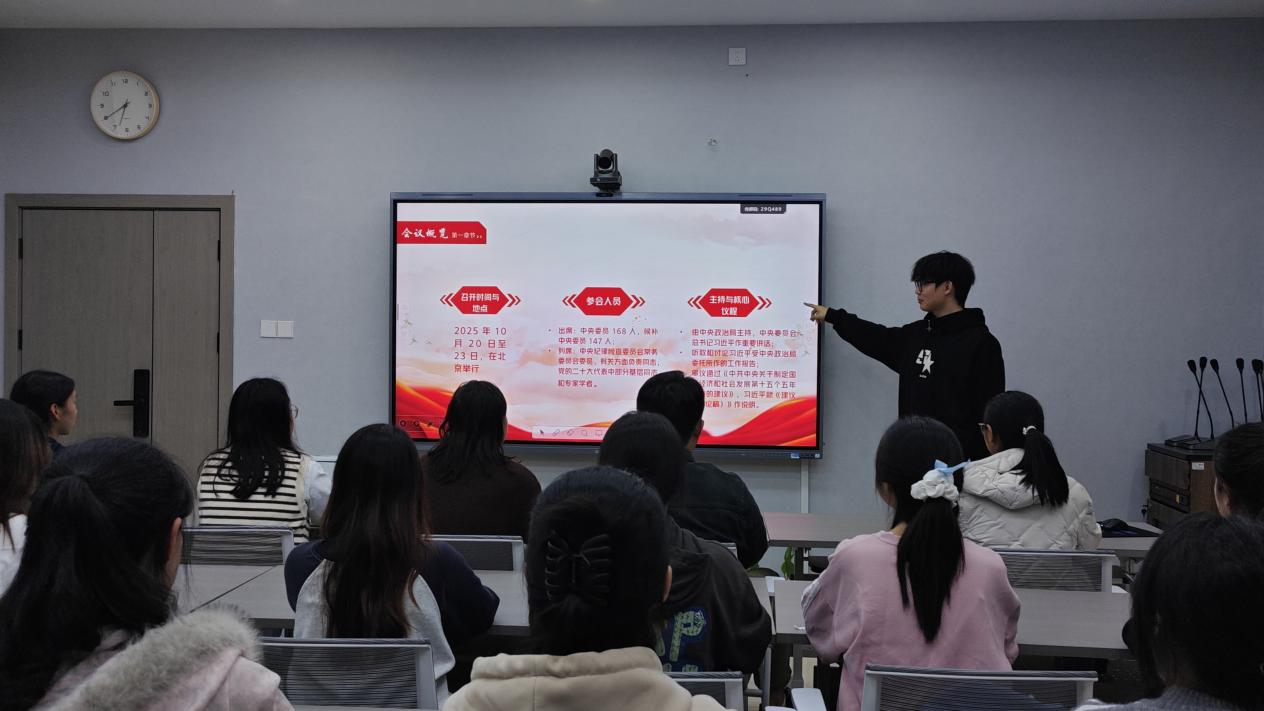 周阳同学领学党的二十届四中全会精神,重点围绕“十五五”时期经济社会发展的原则、主要目标和关键任务展开解读。他结合四中全会提出的“十五五”时期加强公共卫生和改善民生等相关目标,在讲解中带领同学们思考如何把医学知识运用到实际问题中,在健康科普、基层医疗服务等方面发挥作用,用专业知识为身边人带来实实在在的帮助。