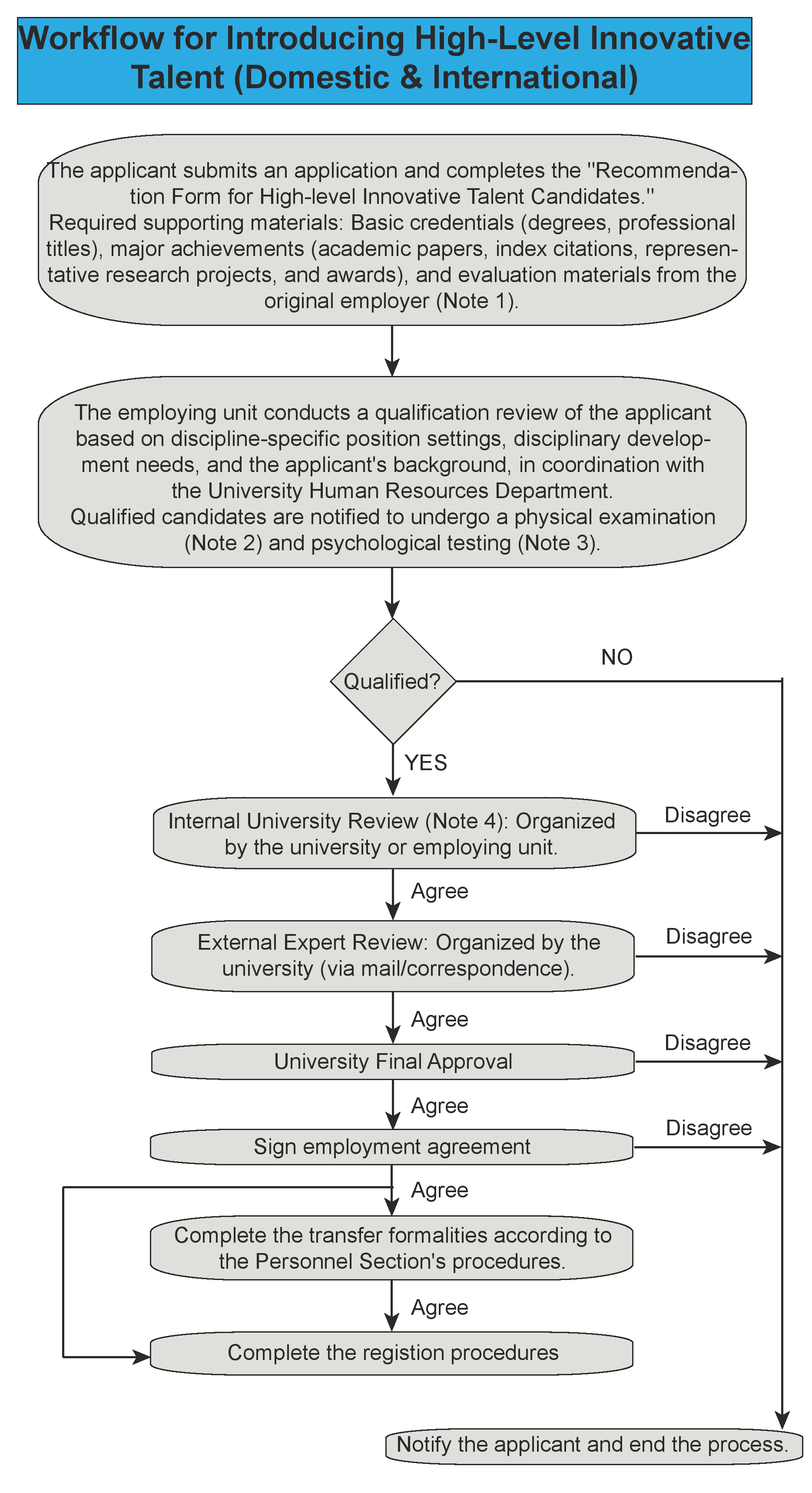 Note 4: Tiers 1 & 2 Talent: The university centrally organizes internal and external expert reviews; Tier 3 Talent: The specific employing unit organizes the internal expert review.Review results must be deliberated by the employing unit’s Professors' Committee and finalized by the Joint Meeting of Party and Government Leaders. After a public notification period with no objections, the results are reported to the Human Resources Department.