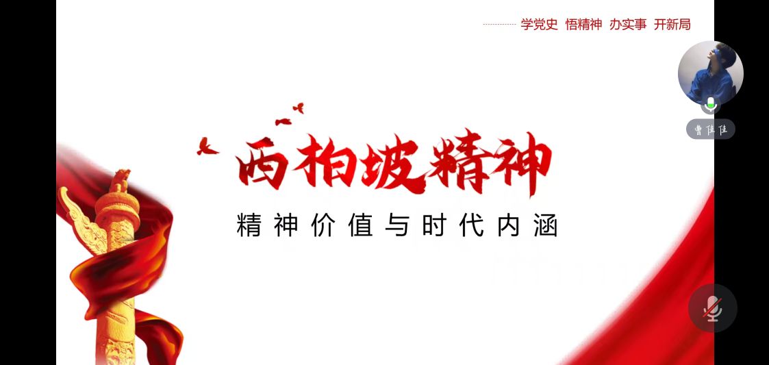 党中央在西柏坡时期铸就的西柏坡精神,在我们党的革命精神谱系中写下了浓墨重彩的一笔,也烛照滋养着中华儿女的成长。回顾峥嵘岁月,党中央在西柏坡召开了全国土地会议,掀起了土地改革风暴;指挥了具有战略意义的三大战役,决定了中国革命的胜局;召开了七届二中全会,提出了“两个务必”的重要论断,绘制了新中国的蓝图。曹佳佳同学带领大家共同学习西柏坡精神的内涵及时代意义,西柏坡精神诞生于中国革命继往开来的特殊时期,是中国共产党人精神谱系的重要组成部分,具有深刻的思想内涵和鲜明的特殊品质。