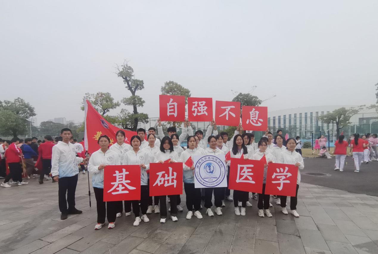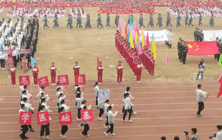 开幕式上,2021级同学踏着整齐的步伐,采用举牌、小红旗的方式展示了“基础医学,自强不息”的学院风采面貌。