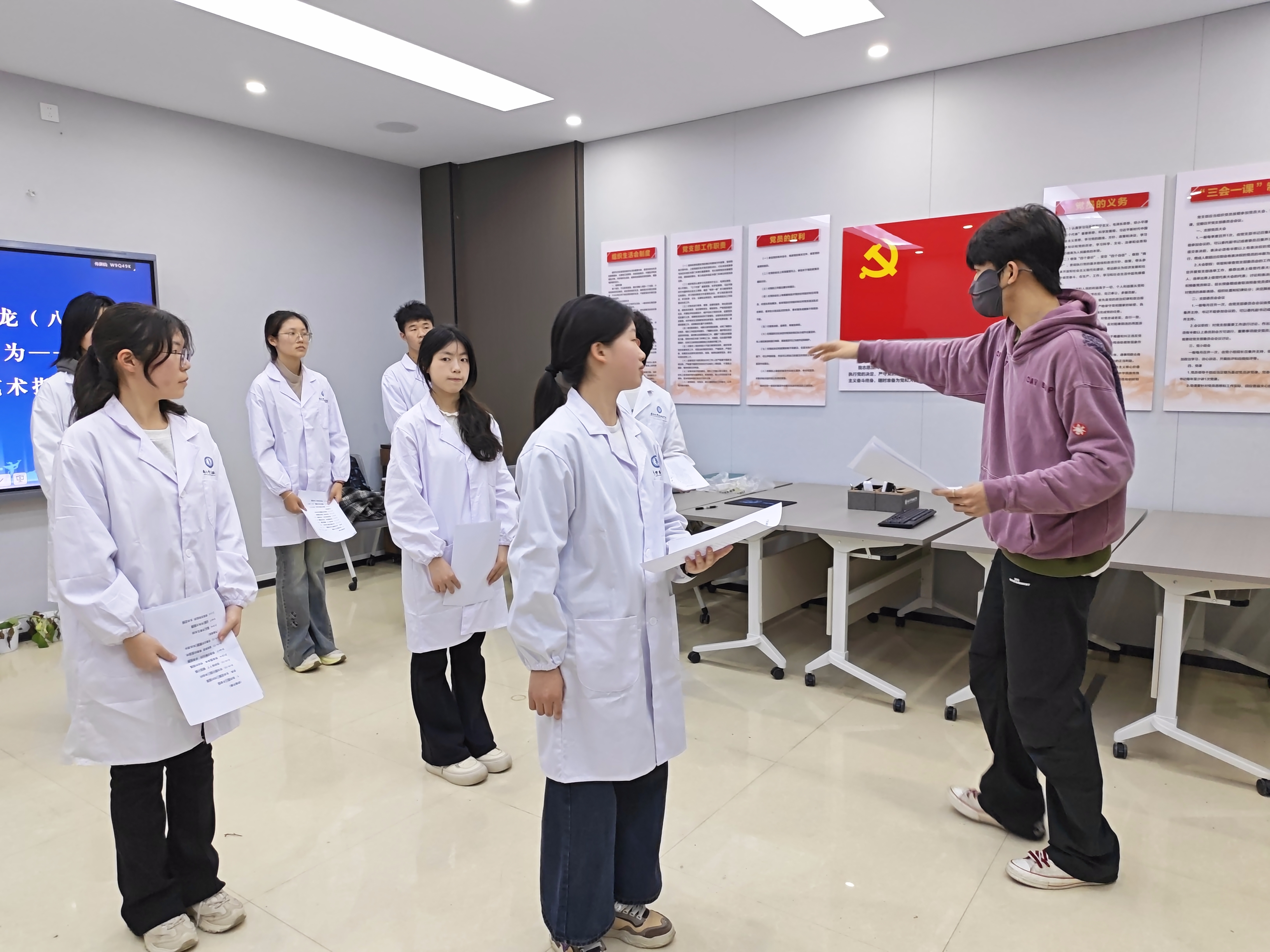老师还对同学们的舞台表现进行了全方位打磨,从站姿仪态、眼神交流到肢体动作,逐一规范指导,并结合红色班级的创新表演形式,为大家提供了兼具思想性与艺术性的朗诵呈现思路。在互动交流环节,同学们积极提问,老师针对大家在朗诵过程中遇到的个性化问题,逐一给予细致解答与专业建议,帮助同学们在原有基础上实现新的提升。