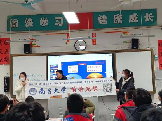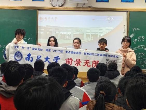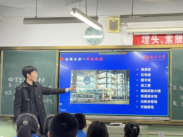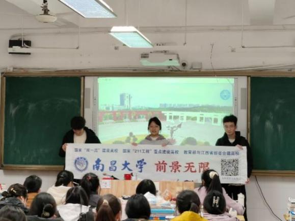 梅铎濛同学回到母校九江市第一中学进行宣讲,讲述了南昌大学前湖校区“来龙仪凤山横翠,润溪龙腾水相连”的优美环境,讲解了校园的学习设施及学习体验,描述了学校发挥多学科综合优势,探索跨学科、跨学院联合培养拔尖创新人才的多样化培养模式,欢迎同学们报考南昌大学。梅铎濛同学说“母校的桃花与同学们灿如桃花的笑脸是永远看不够的,希望能够与高中同学们一同相聚润溪湖畔、杨简桥边,共赏校园美景,共逐青春梦想!”