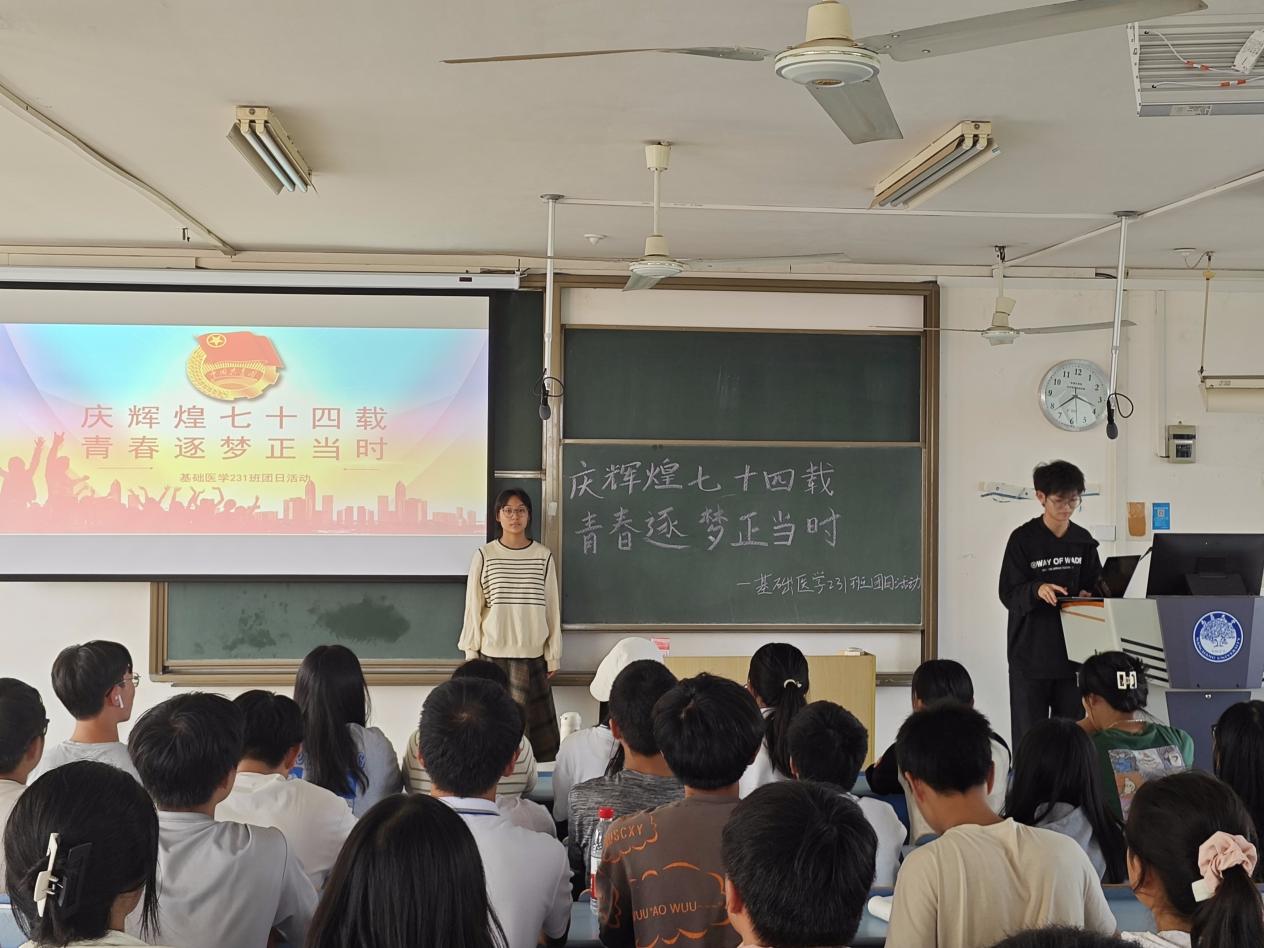 峥嵘岁月,风雨兼程,今年是新中国成立七十四周年,为凝聚青年力量,进一步激发青年爱国热情,基础医学231班组织开展了2023年度第三阶段以“庆辉煌七十四载,青春逐梦正当时”为主题团日活动。