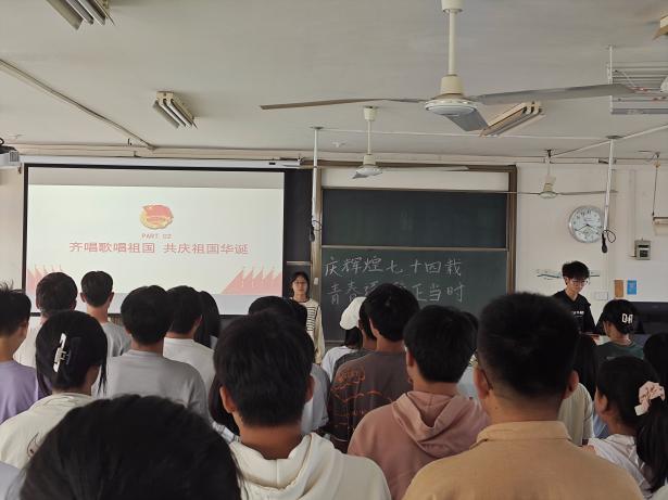 为更好的激发同学们的民族自豪感和自信心,全体起立,合唱《歌唱祖国》,随着伴奏响起,歌词不由自主地出现在了大家的脑海中,“五星红旗迎风飘扬,胜利歌声多么响亮;歌唱我们亲爱的祖国,从今走向繁荣富强。歌唱我们亲爱的祖国,从今走向繁荣富强……”唱到此处,大家的声音不约而同地更加嘹亮高昂,彰显了新时代青年人对于祖国的热爱以及对美好未来的期盼和向往。