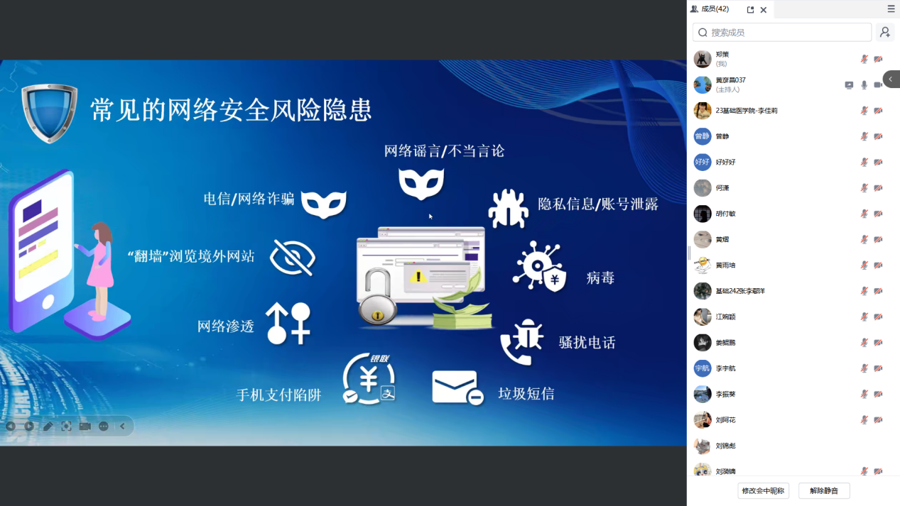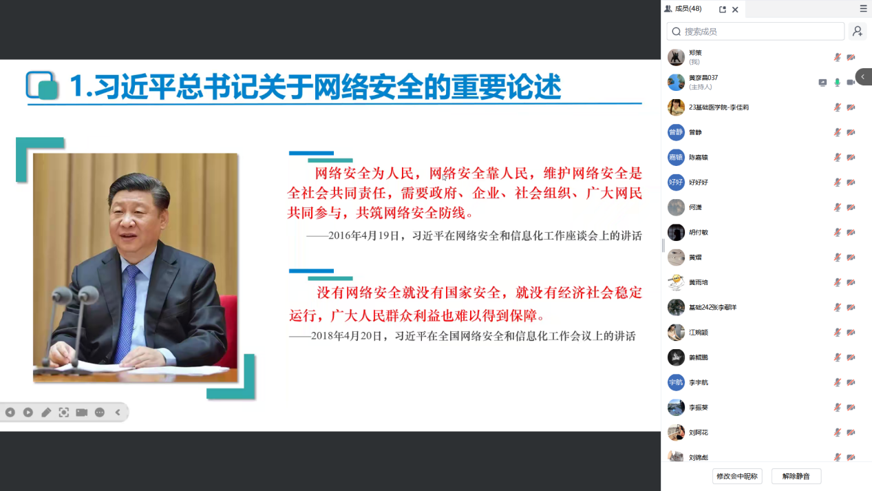 (编辑:何潇 徐国群;摄影:何潇)为深入学习贯彻习近平总书记关于网络强国的重要思想,全面提升学生的网络安全意识和防护技能,12月29日,基础医学院研究生开展“网络安全专题教育”主题班会,本次主题班会由2024级硕士2班班长黄彦昌同学主持,2024级硕士2班全体同学参加。