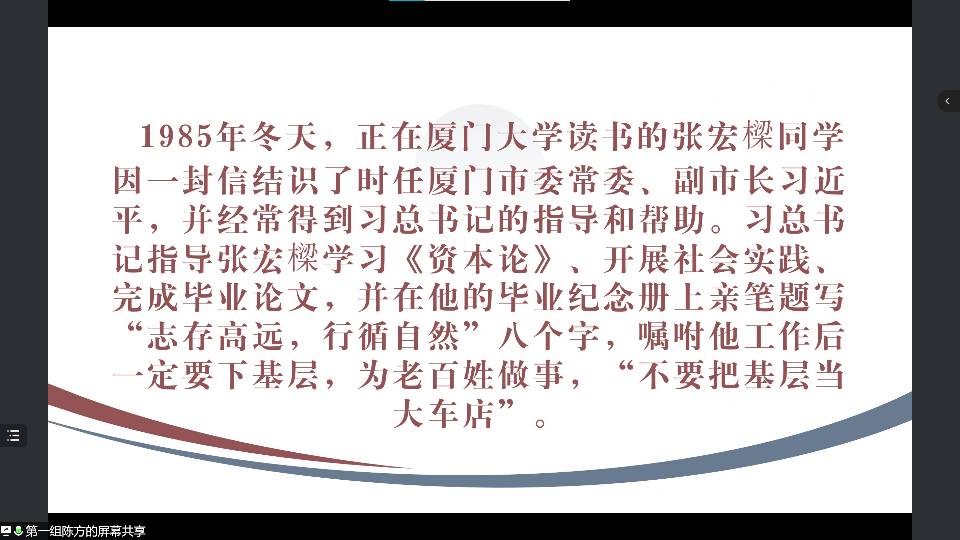 陈方同学表示在众多采访实录中,给她印象最深的是张宏同学的采访。习近平总书记指导张宏学习《资本论》、开展社会实践、完成毕业论文,并在他的毕业纪念册上亲笔题写“志存高远,行循自然”八个字。“行循自然”有两层含义,一层含义是告诉我们要“行”,要积极投身实践,这也是另一层含义是提醒我们“循自然而行”,“行”固然重要,但是要找到正确的方法,即循“自然”。跨越34年的时间长河,“行循自然”是习近平总书记对青年的殷殷嘱托中始终不变的核心“关键词”,是习近平总书记送给不同时代青年的具有持久生命力的成长箴言与人生信条。