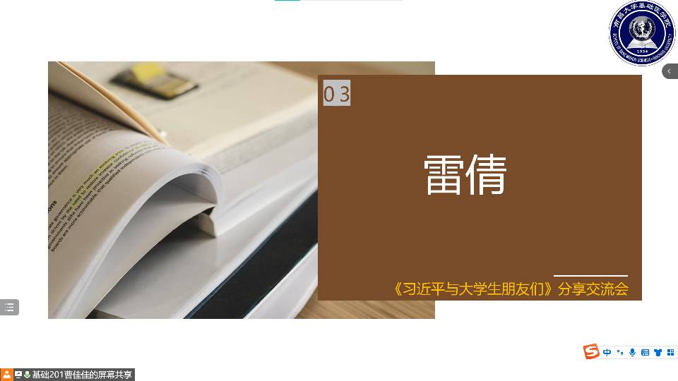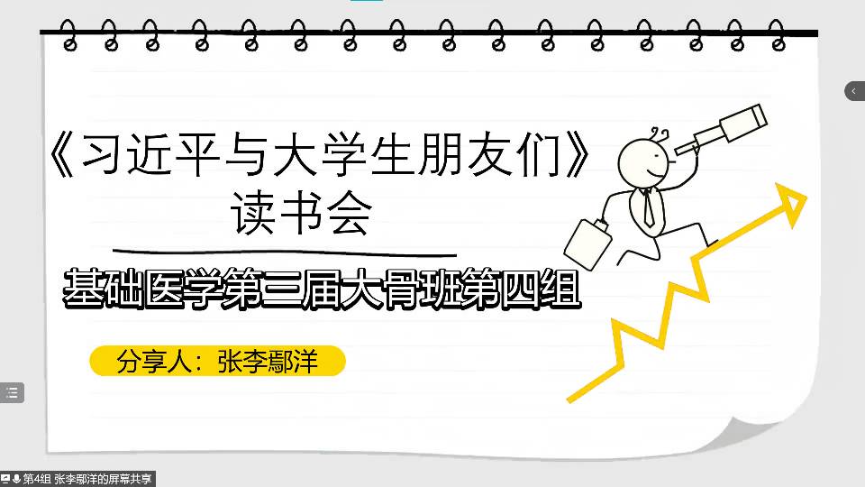 为深入学习贯彻习近平新时代中国特色社会主义思想和习近平总书记关于青年工作的重要思想,感悟习近平总书记对青年的亲切关怀和殷切期望,提高大学生的思想政治素质及政策理论水平。基础医学院本科生于2022年04月27日19:00开展线上《习近平与大学生朋友们》读书分享会。