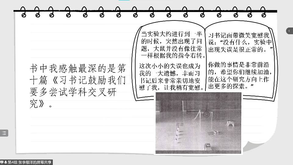张李鄢洋同学表示在这四十余篇访谈中,给他感受最深的是第十篇。时任浙江省委书记的习近平来到浙江大学高等研究院脑机接口实验室观看 “大鼠机器人”项目演示。然而,那次实验郑晓静老师并未成功。在访谈中,郑晓静老师表示既有实验失败后的愧疚,也有书记鼓励年轻人参加学科交叉研究后的激动。最后,他总结得出:我们做研究就要不怕失败,掌握核心技术的过程很艰难,但这条道路必须走。沟通存在障碍就积极展开学科对话,做到相互理解;样本数据不够就尽力开拓样本来源;知识水平不够就去提升自己。