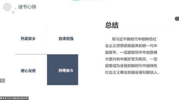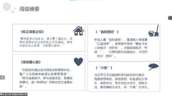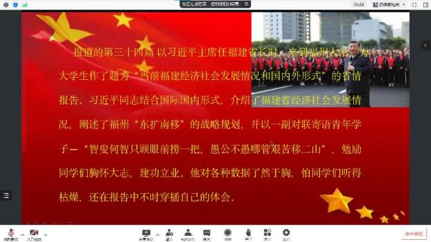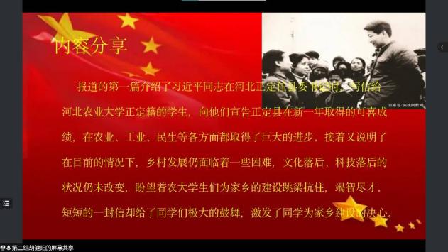 首先,雷倩同学简单介绍了书籍创作背景。紧接着,她分享了其在阅读过程中遇到的好词好句。在第一期采访中,采访对象曹兵海回忆道:“习近平同志曾发表了《知之深爱之切》一文,文章写道:‘要热爱自己的家乡,首先要了解家乡。深厚的感情必须以深刻的认识作基础。唯有对家乡知之甚深,才能爱之愈切。’”在第二十一期的采访中,习近平总书记前往中国科学技术大学考察并勉励同学们做有理想、有追求的大学生,做有担当、有作为的大学生,做有品质、有修养的大学生,即“‘六有’大学生”。最后,雷倩同学表示:用习近平新时代中国特色社会主义思想武装起来的新一代中国青年,一定能够成为合格的中国特色社会主义事业的建设者和接班人。