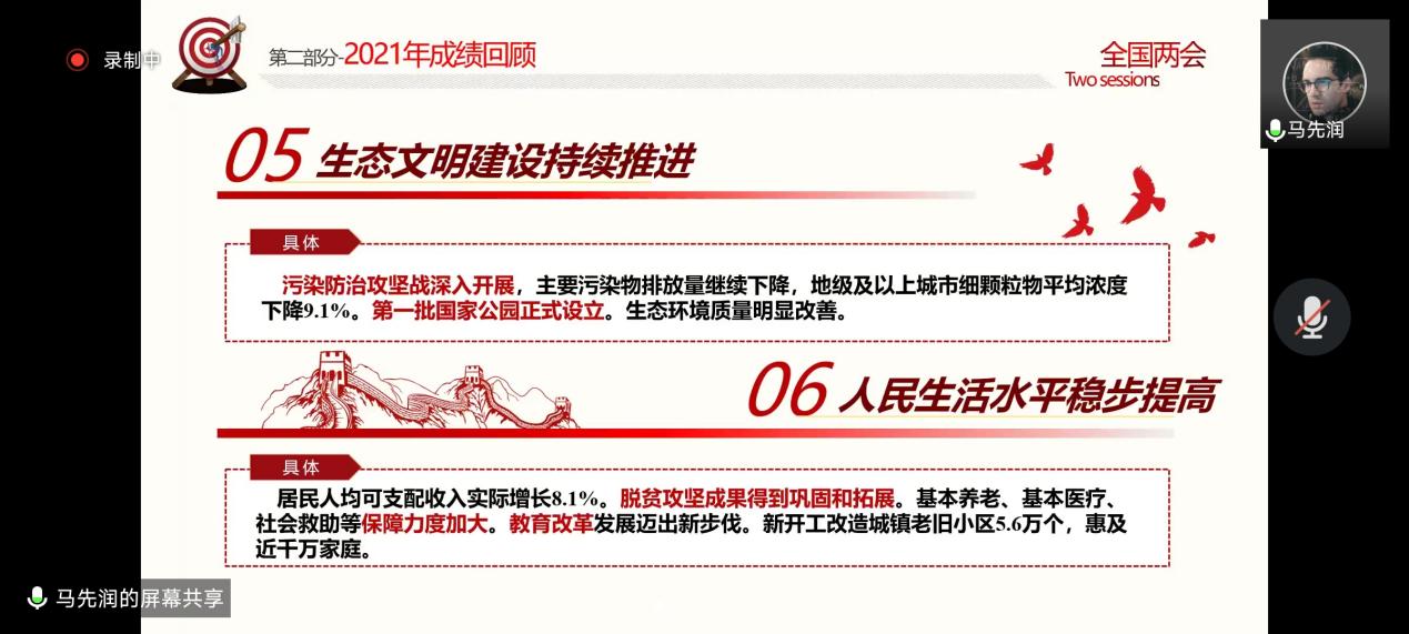 站在全国两会这个时间节点上,我班开展了观看“十三届全国人大五次会议”活动和红色青年说:“聚焦全国两会——稳字当头,稳中求进”分享会活动。学习全国两会精神,是我们每个公民的职责所在,贯彻落实两会精神,更需要落实到我们每个人的行动中。