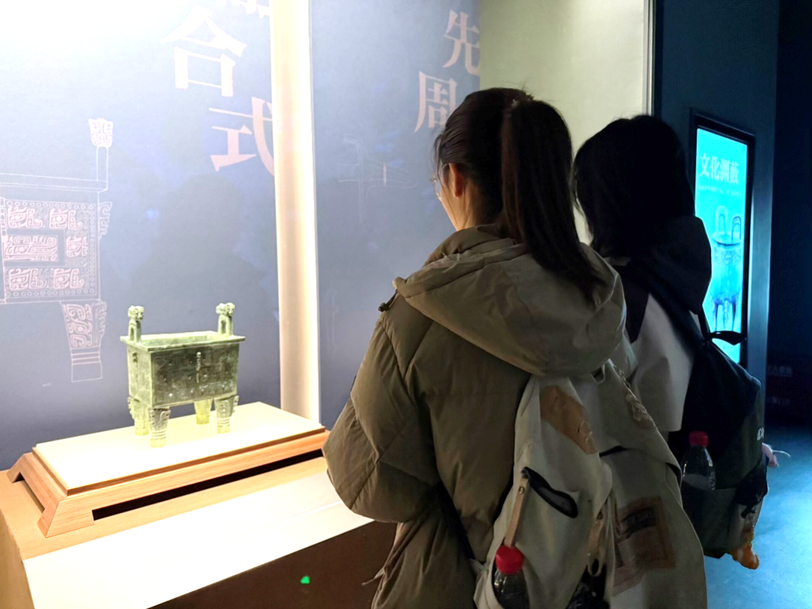 步入馆内,同学们循着展陈脉络,依次参观了江西古代文明展、红色摇篮革命史陈列、陶瓷文化展等核心展区。在一件件精美文物前,大家驻足凝望:惊叹于商代伏鸟双尾青铜虎的精巧铸造,沉醉于景德镇瓷器的莹润雅致,动容于革命文物背后的热血峥嵘。从远古的文明曙光,到近代的红色征程;从璀璨的陶瓷艺术,到鲜活的赣鄱非遗,同学们在沉浸式参观中,不仅触摸到了江西历史的温度,更读懂了赣鄱文化的深厚内涵。