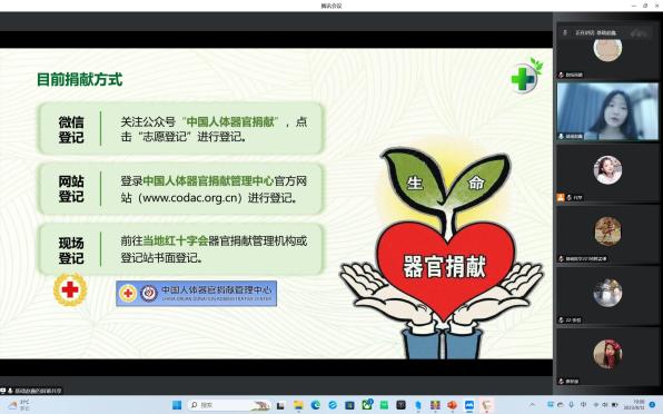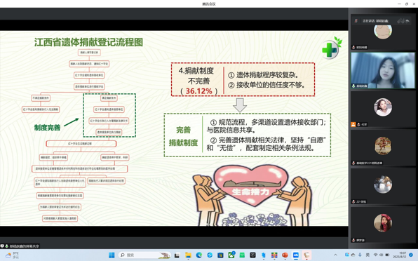 赵鑫同学立足于遗体器官捐献知识的调研成果,向同学们讲述了关于“遗体捐献在医学教育上的现状分析(以江西为列)”的调研背景、目的和意义,介绍了调研方案及实施过程,提出针对遗体器官捐献现存问题的改善措施。赵鑫同学详略得当的讲解不仅提升同学们开展调研活动书写调研报告的能力,加深了同学们对遗体器官捐献知识的了解,激励同学们主动投身到志愿服务事业中去。