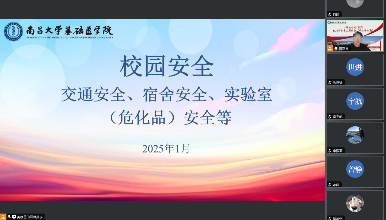 (编辑:何潇 徐国群;摄影:何潇)寒假将至,为确保同学们度过一个安全、愉快且充实的假期,1月12日,基础医学院研究生开展“研途时光”主题班会(第三十七期)暨寒假安全主题教育。本次主题班会由2024级硕士2班班长黄彦昌同学主持,2024级硕士2班全体同学参加。