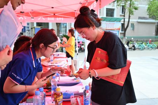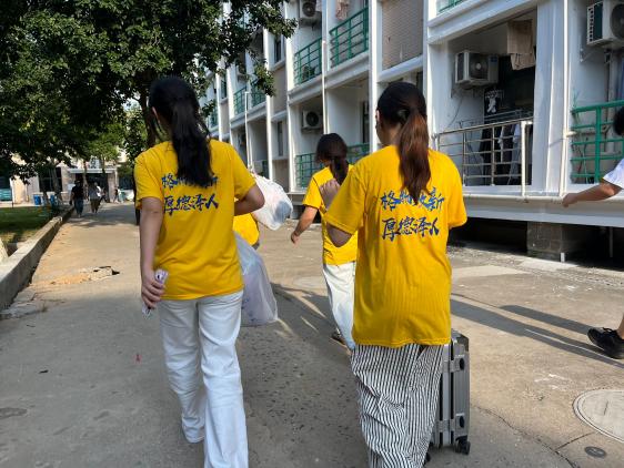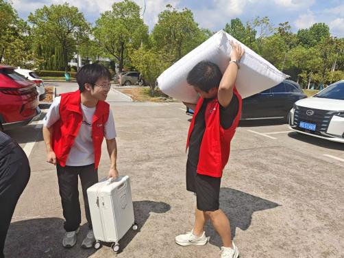 活力橙、志愿红、迎新蓝交相呼应,绘就迎新期间靓丽画卷。从报到点至寝室楼,迎新志愿者穿梭不息——解答、引路、搬运……他们踏实而可靠,如点点微光,照亮同学们最初的路。