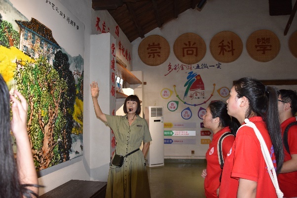 暑期社会实践服务队一行人在王葳老师的带领下进入体验园。当大家抬头看向“共青社”的门头时,不禁心生崇敬之情。看到这三个斑驳的大字,共青社与98名垦荒队员的艰苦岁月与光辉业绩立即在心中浮现。在讲解员的解说与带领下,实践服务队员们徐步走进体验园区。在园内,实践服务队员们一一走过垦殖场旧址、垦荒创业图片展厅、民俗(农耕文化)博物馆和篝火广场,展厅二楼陈列室按照“坚韧不拔”“艰苦创业”“崇尚科学”“开拓奋进”四个主题布展,再现了老一辈“共青人”在金湖乡建立垦殖场,办机耕队、砖瓦厂、板鸭厂的创业历程。