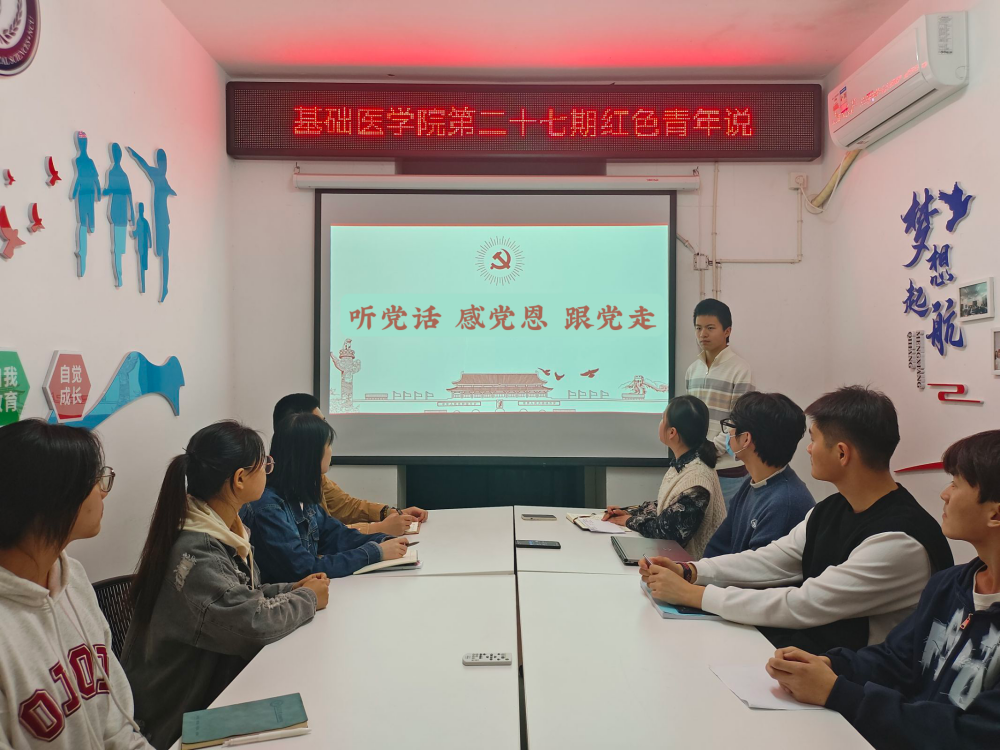 青年的理想信念关乎国家未来。为进一步加强青年学生的思想引领工作,提高青年学生的凝聚力与党性修养,基础医学院本科生党支部于4月开展了第27期“红色青年说”微党课。本期由梅铎濛同学围绕“听党话,感党恩,跟党走”进行主讲,本科生党支部及理研会成员共计20余人参加此次微党课学习。