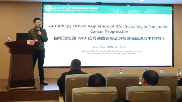 随后,来自湖北工业大学的周策凡教授作为本次学术会议特邀报告人以“Autophagy-Driven Regulation of Wnt Signaling in Pancreatic Cancer Progression”为题与广大师生进行了互动交流。周教授详细地介绍了团队自2015年开始的科研探索经历,从第一篇成果开始循序渐进地讲述了其团队在探索自噬与肿瘤领域做的相关工作,并重点介绍了其实验室最新在Wnt信号通路调节中的关键工作。周教授的讲述引发了现场听众对于自噬最新功能及研究的极大兴趣,在交流互动环节纷纷就该内容展开热烈讨论。