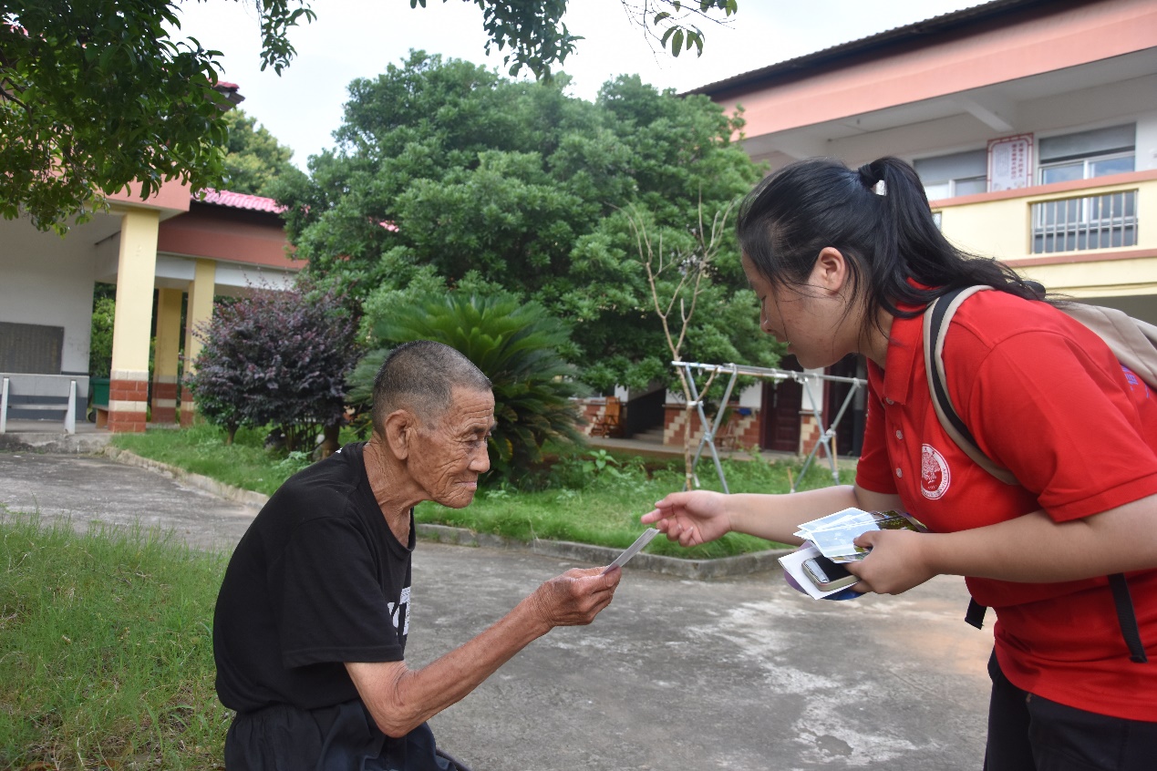 (实践队员为老人们分发照片)