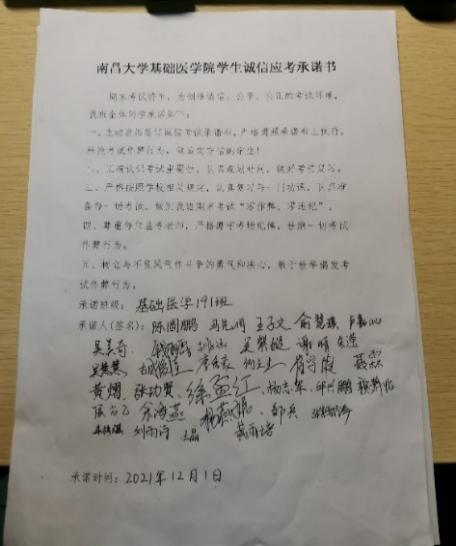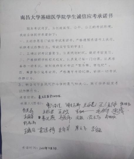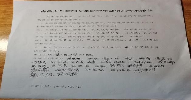 为鼓励大家将诚信应考落在实处,基础医学院组织全体学生签署诚信应考承诺书。同学们在认真阅读《诚信应考承诺书》之后,都在承诺书上郑重签名,庄严承诺。