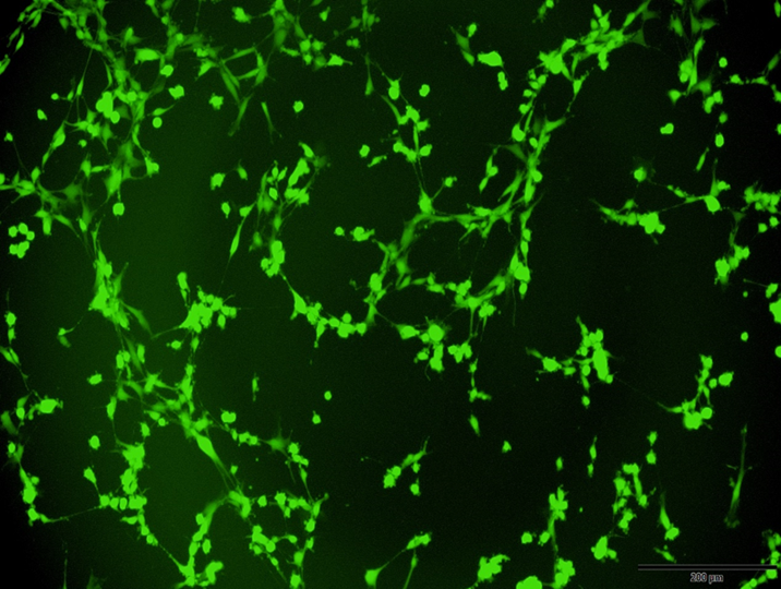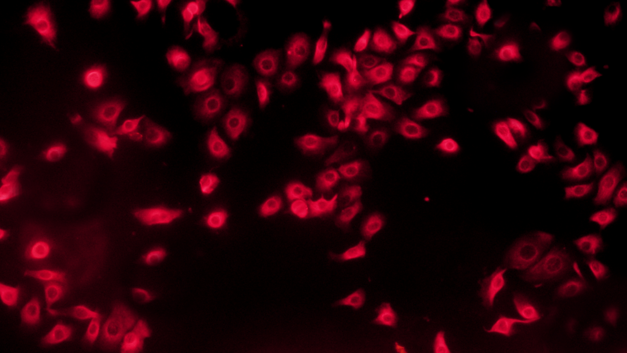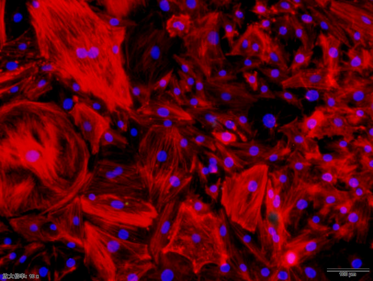 作品描述:本作品是使用鬼笔环肽对人颗粒细胞进行染色,其中红色的丝状结构为细胞骨架-肌动蛋白。肌动蛋白丝在细胞中形成更大规模的网络,就如同生命之网一般,编织出绚丽多彩的生命架构。