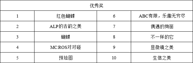 优秀奖:红色蝴蝶、ALP的古韵之美、蝴蝶、MC:ROS对对碰、预培图、ABC有限,乐趣无穷尽、偶见的绚丽、不一样的它、显微镜之美、生信之美