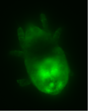 作品描述:图中的动物是椭圆食粉螨,它是仓储物品和食用菌中的重要害螨,将椭圆食粉螨染色后用正置荧光显微镜进行观察并拍摄,可以清楚的观察到其形态特征,虽然它是害螨,但是在镜头下的它就像一只蠢萌的小胖虫。
