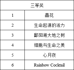 三等奖:晶花、生命起源的活力、鄱阳湖大地之树、细胞与生命之美、心月夜、Rainbow Cocktail