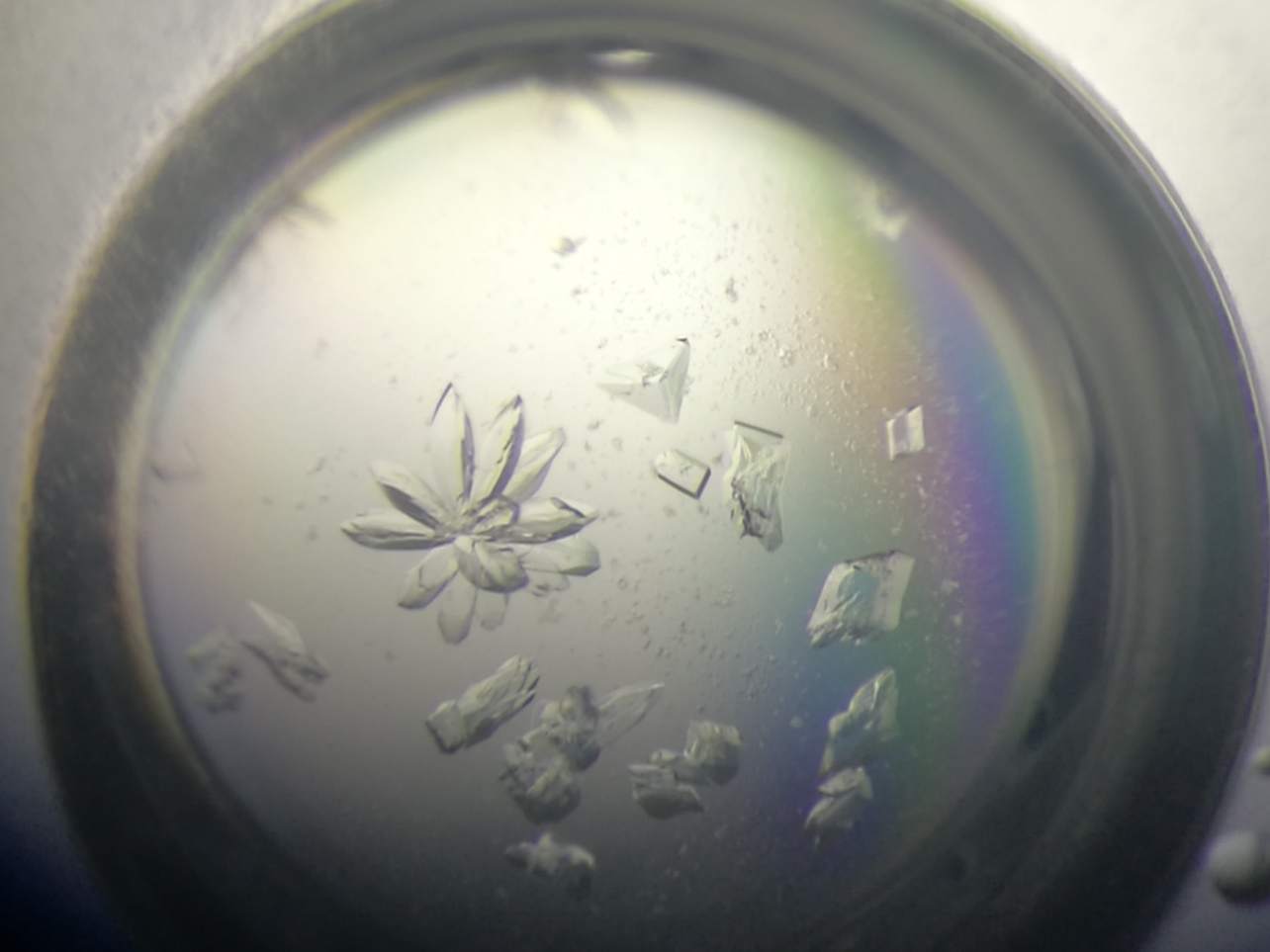 作品描述:芳洁无声般神奇,病毒晶莹绽芳菲。蛋白质晶体通常呈现不同的形态,如规则的针状,棒状几何,球面形态,甚至杂乱无章。在一次偶然的病毒蛋白点晶体中,我们获得了这花朵形状般的晶体。
