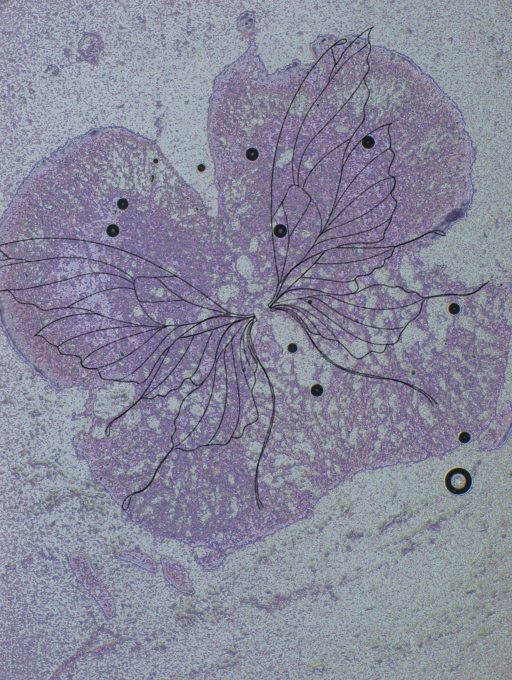 作品描述:原图为大鼠脊髓切面免疫组化结果图,蝴蝶状结构为脊髓灰质,是神经系统的重要成分。蝴蝶飞舞,我们也要像蝴蝶一样有破茧的勇气,优雅起舞。