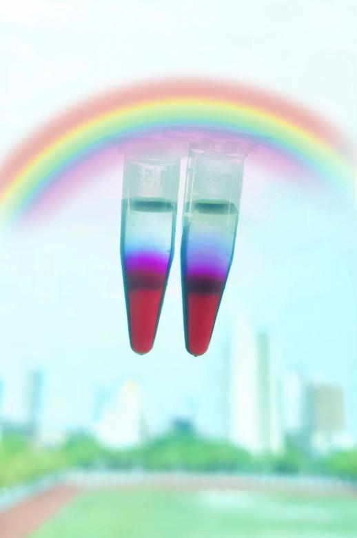 作品描述:两水夹明镜,双桥落彩虹。不同的化学试剂与生物蛋白汇聚成了绚丽多彩的虹霓。科研不仅是欣赏彩虹的灿烂夺目,更是享受七色分明的形成过程。就像Rainbow Cocktail,我们对通过不同比重密度的原料而调出美丽绚烂的色彩更加惊讶。