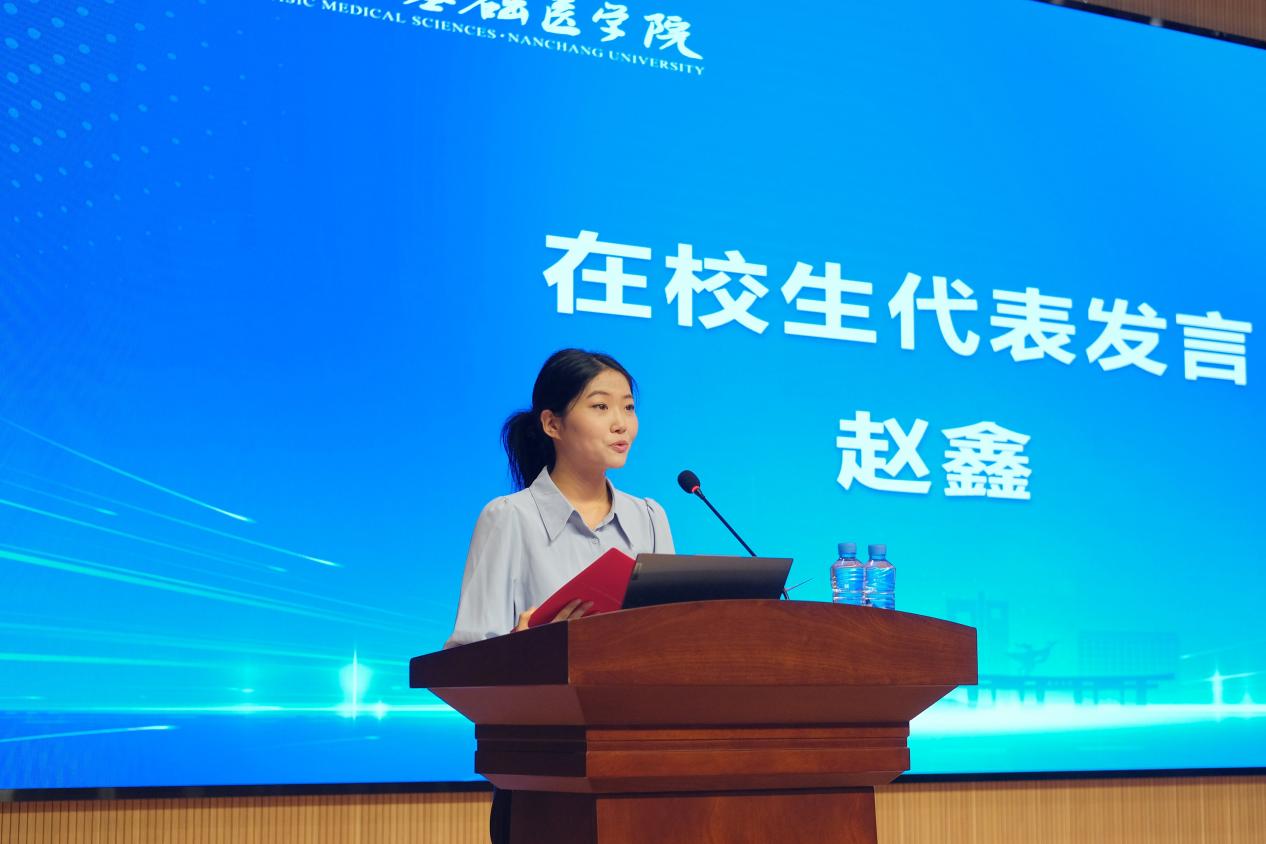 新生代表2025级研究生刘牧鑫与在校生代表2021级本科生赵鑫分别发言。刘牧鑫回顾了在南昌大学本科阶段的成长,表达了对学校快速发展和学术成就的自豪,因此他坚定选择留在南昌大学基础医学院继续深造。他表示,未来将继续以严谨态度投身科研,将个人理想融入医学事业,践行医者的责任与担当。