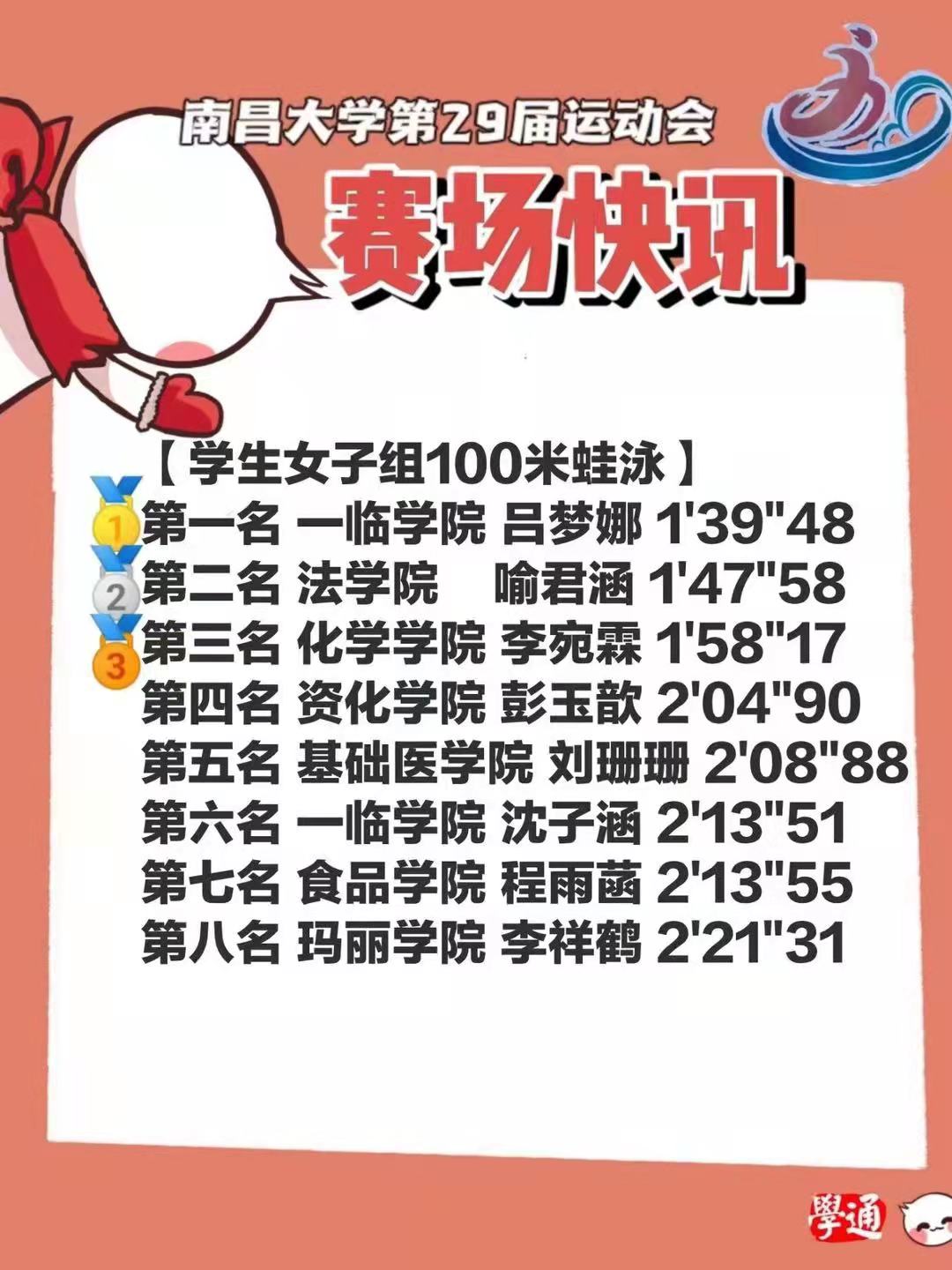 每一次摆臂、每一次蹬水都是对体力的极大挑战,但运动员的精神就是坚持到底,永不放弃。最终,刘珊珊同学获得了100米第五名、50米第七名的优异成绩,向刘珊珊同学表示热烈的祝贺!