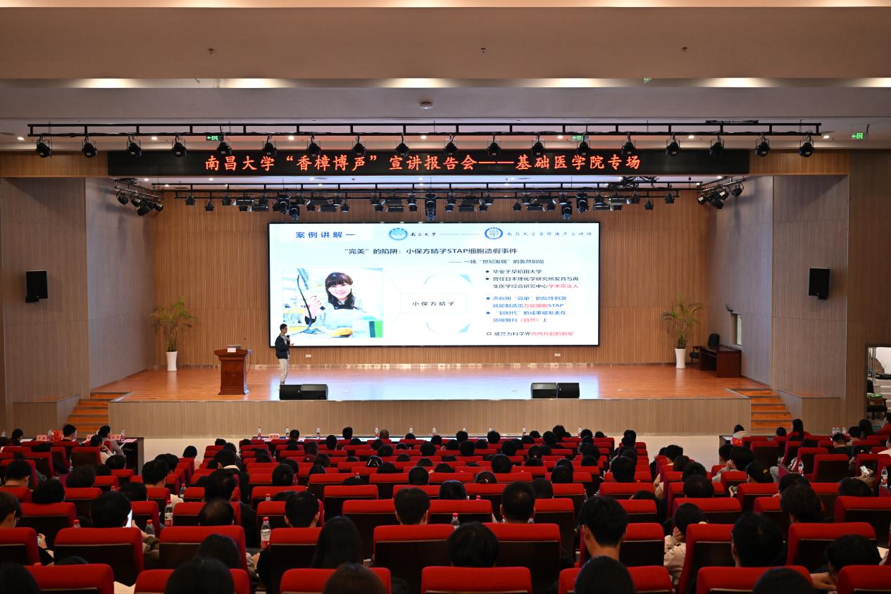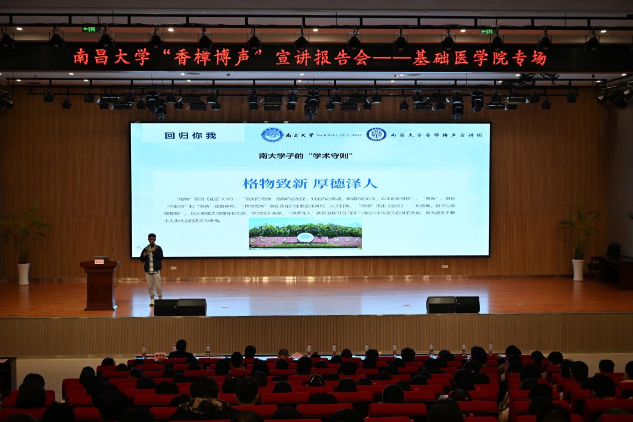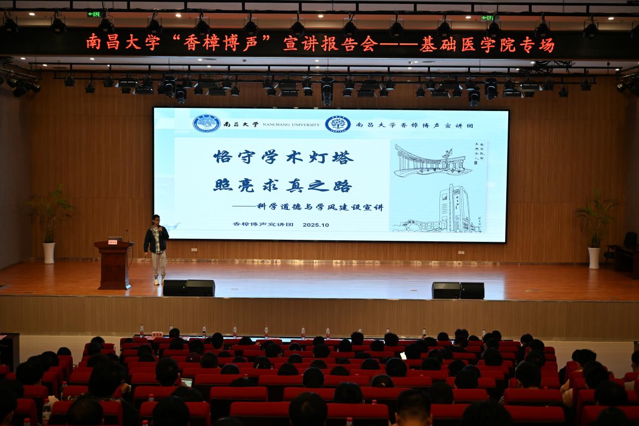 为引导同学们明确学术研究的道德底线,锻炼严谨的学术品格,10月31日晚,基础医学院邀请南昌大学香樟博声宣讲团成员谢陈润泽同学到我院宣讲。本次香樟博声宣讲暨红色微讲堂(第65期)活动以“恪守学术灯塔,照亮求真之路”为题,在前湖南院医学科技创新中心学术礼堂进行,学院学生共计400余人参与。