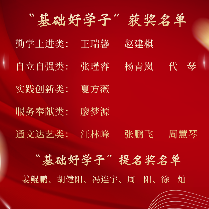 经过激烈角逐,各位选手的最终得分逐一揭晓,王瑞馨等10人荣获“基础好学子”荣誉称号,姜鲲鹏等5人荣获“基础好学子”提名奖。