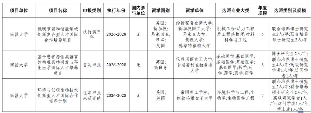 本次立项项目每年计划选派规模为20人,执行期三年。学校将与英国帝国理工大学、英国玛丽女王大学、新加坡国立大学、日本筑波大学、西班牙卡斯蒂利亚拉曼查大学等外方单位合作,推进机械工程、动力工程及工程热物理、材料科学与工程、基础医学、药学、环境科学与工程、生物学、生物医学工程等专业建设,开展拔尖人才合作培养。国家留基委为相关派出人员提供一次往返国际旅费及规定期限内的奖学金支持。