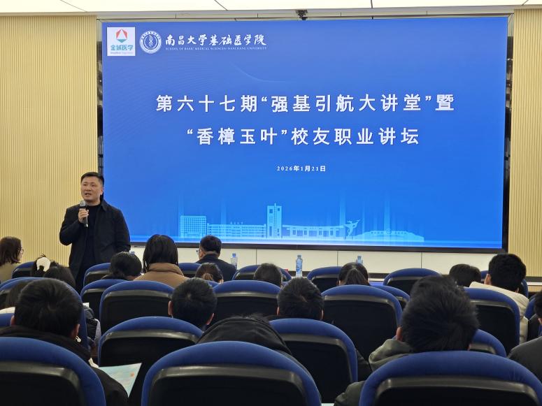为帮助基础医学学子深化对行业就业环境的认知,明晰职业发展方向,科学规划成长路径,近日,南昌大学基础医学院第六十七期“强基引航大讲堂”暨“香樟玉叶”校友职业讲坛在前湖南院顺利举行。本次活动,学院邀请到了江西金域医学检验实验室有限公司业务部经理钟凯、运营经理涂星担任主讲嘉宾,学院副院长段德华、刘琼出席活动,共计170余名学生参加。
